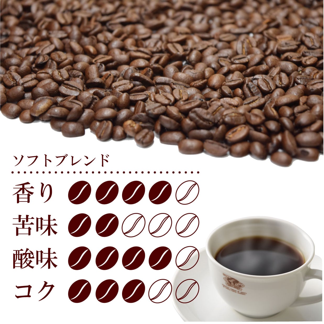 まろやかな風味とコクが調和したバランスのとれた飲み易いブレンドコーヒーです。