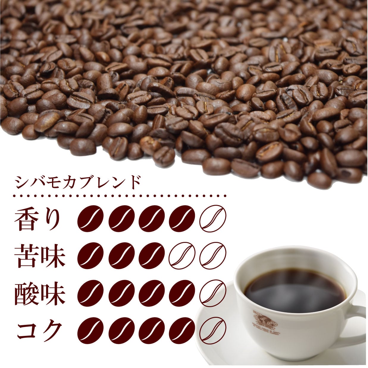 コーヒー発祥の国「エチオピア」の最高級品のシバモカシダモをベースにブレンドしたコーヒーです。気品高くバランスのとれた酸味をお楽しみください。